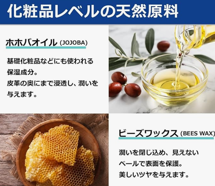 が乾燥した革に潤いを戻し、自然なツヤを与えます。