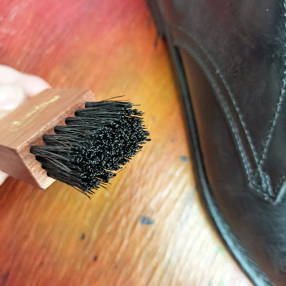 ブラシを使ってクリームを伸ばすことで、少量でも革全体にきれいに行き渡ります。