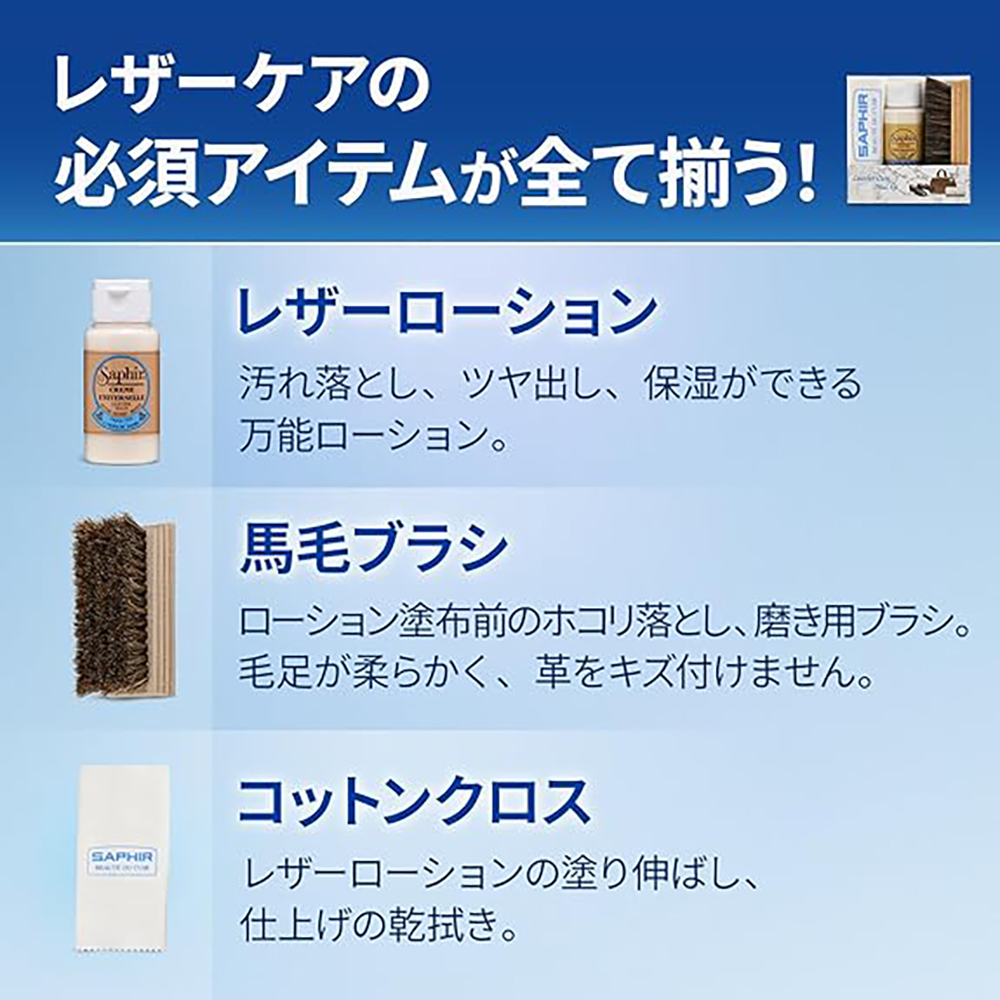 新生活で革製品のお手入れを始めたい方、何を揃えればいいか迷う方に向けて、基本の3点が揃ったトライアルキットをご紹介します。汚れを落としながら保湿もできるサフィールのユニバーサルレザーローション(ミニサイズ)と、ブラシ・クロスを組み合わせたシンプルな内容。簡単3ステップで始められ、最初の一歩にちょうどいいセットです。