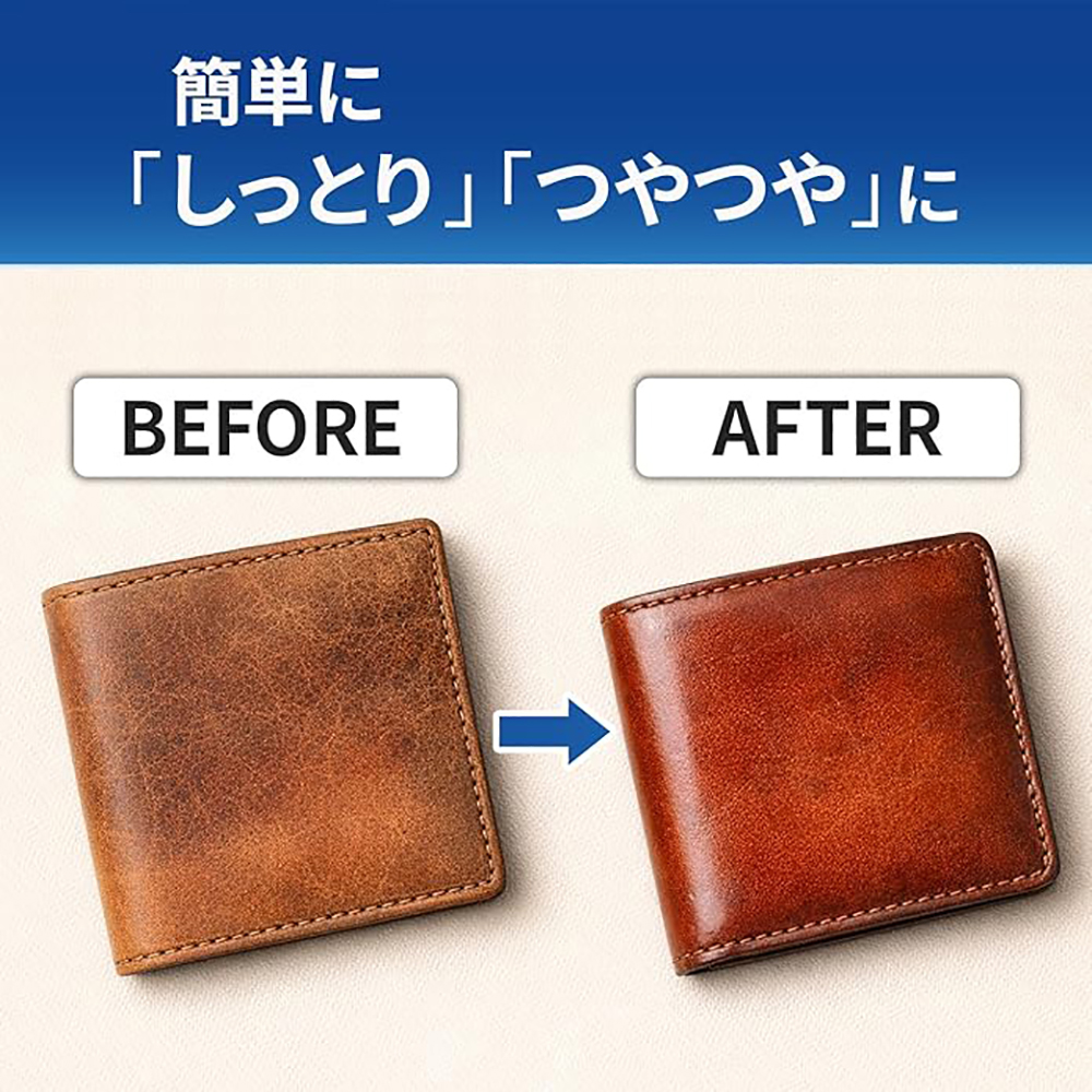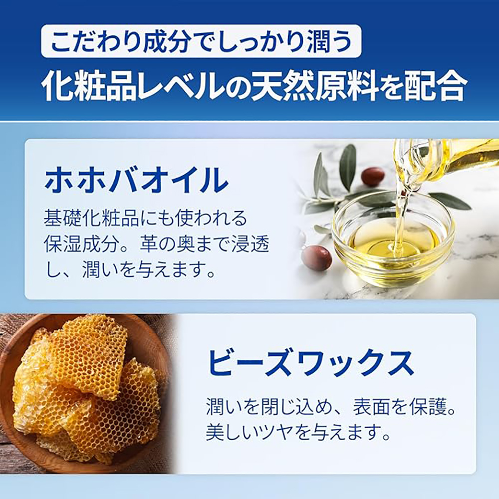 ビーズワックスやホホバオイルが、乾燥しがちな革に自然なツヤと柔らかさを与えてくれます。